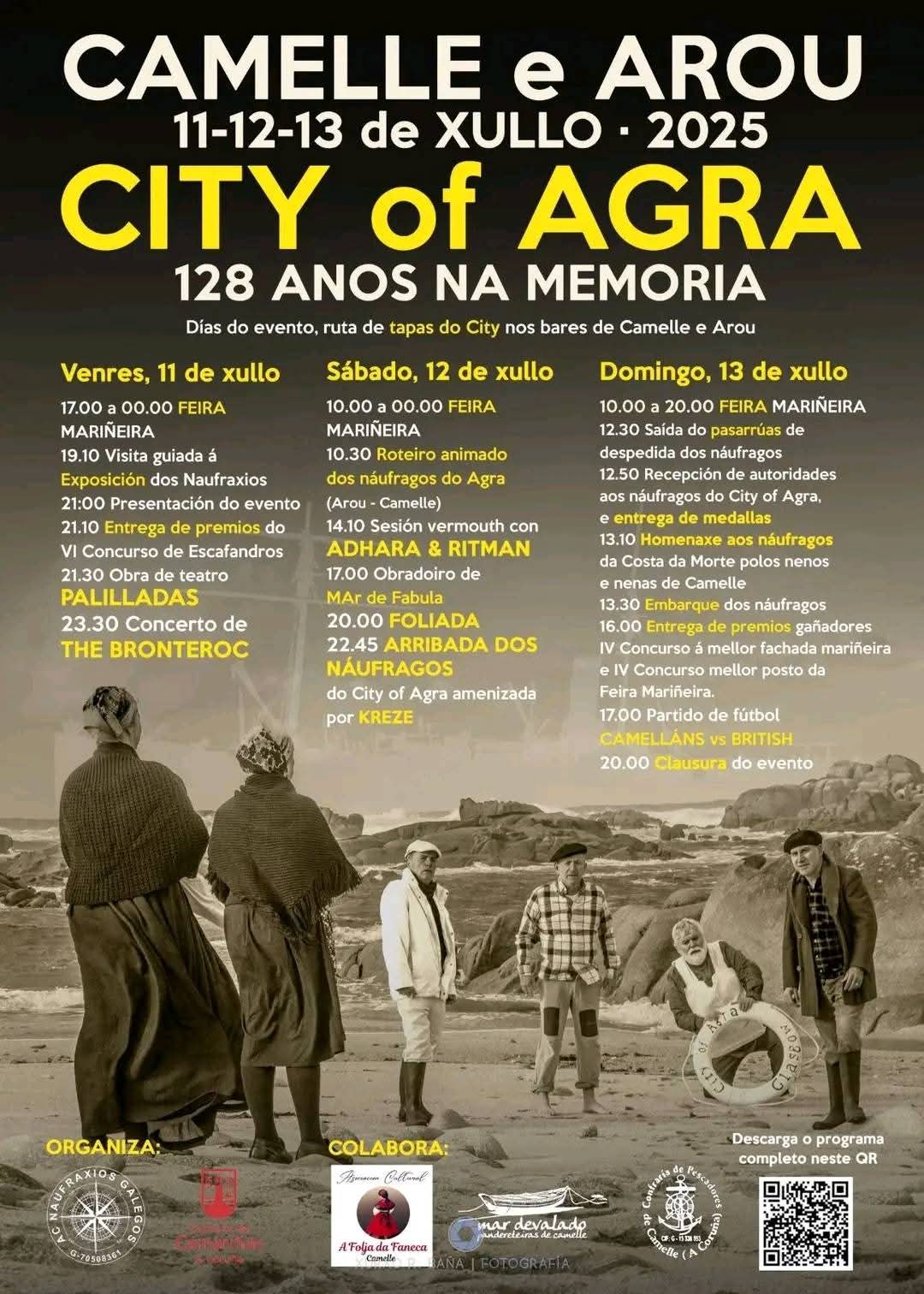 O Concello de Camariñas acollerá esta fin de semana, do 11 ao 13 de xullo, a sexta edición do evento “City of Agra, 128 anos na memoria”, o maior programa cultural dedicado a un naufraxio en Galicia, que se desenvolverá en Camelle e Arou polos 128 anos da catástrofe do buque inglés.