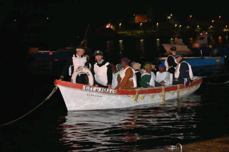 Ás 22.45 horas, dará comezo o acto máis simbólico, emotivo e agardado de toda a fin de semana: a Arribada dos náufragos ao porto de Camelle, tras ser salvados e auxiliados polos mariñeiros camelláns. A campá orixinal do City of Agra que, un día estivo a bordo deste buque, e que de seguro tocouse no derradeiro intento de avisar aos seus tripulantes para que abandoasen o barco, voltará a soar exactamente ás 22.45 horas, e inmediatamente despois, tres grupos de veciños percorrerán Camelle por tres rúas diferentes, converxendo na rampla do porto, dende onde embarcarán as jamelas para o rescate dos náufragos. Todo o acto está milimetrado, teatralizado e ben recreado, contando dende o alto da rampla cun presentador que vai describindo as tres etapas das que consta este acto, na compaña do concerto de música de cámara de Kreze, que ambienta este icónico momento que xa vivimos con eles na anterior edición. Outra banda emerxente de excelentes músicos. Coa chegada a porto dos superviventes, a súa acollida, atencións e coidados ofrecidos pola veciñanza de Camelle, darase por rematado o acto sacándose a foto final de grupo co colofón da sesión de lumes de artificio. Deseguido e, aproximadamente ás 12 da noite, dará comezo unha actuación de monólogos no palco do Teatro, a cargo dos 5 magníficos de Camelle: Demi Marcote, Luís do Prixelo, Lolo Castro, Ismael Cernadas e Alberto de Jillermina. Esta actuación pechará a segunda xornada.