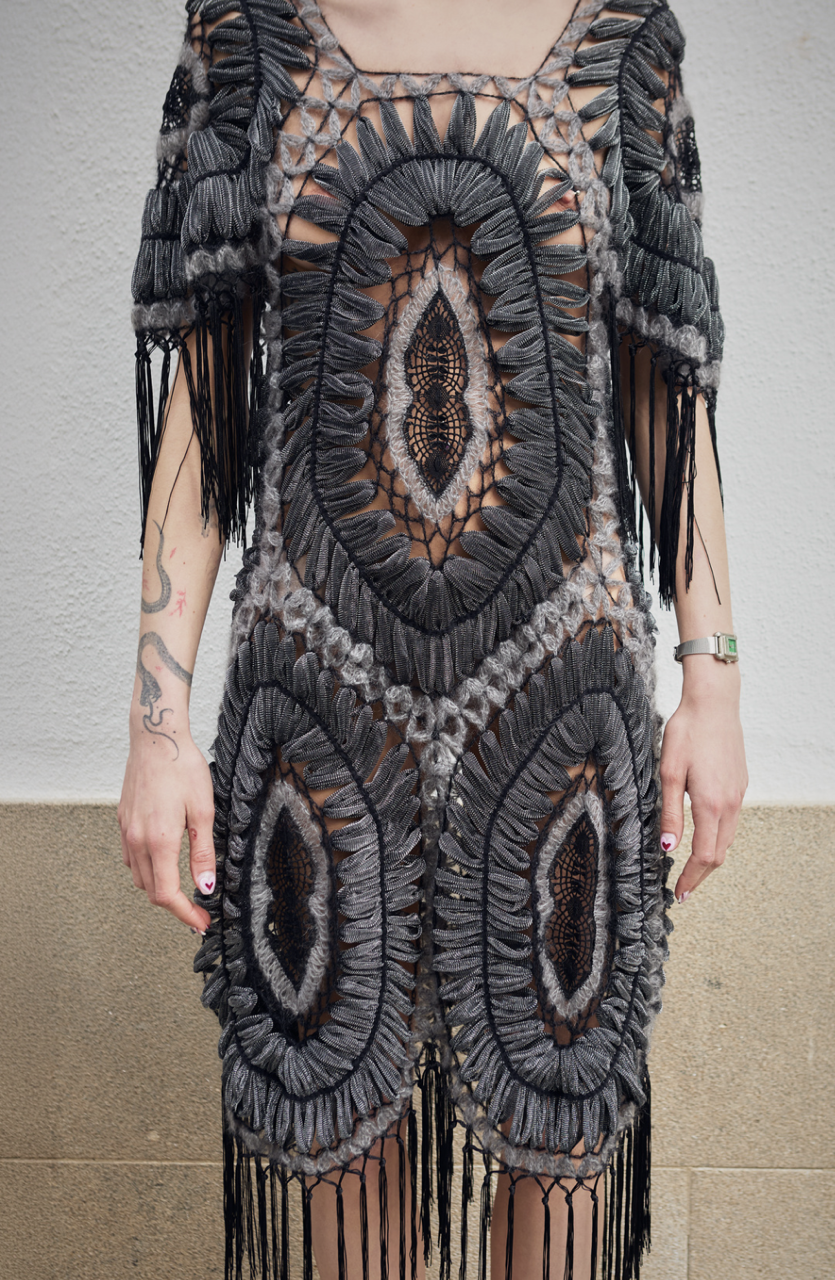 A deseñadora xoga coa dualidade colocando encaixes extremadamente precisos en patróns que rompen a norma. "Para min, cada prenda é un pequeno manifesto: o palillo conserva o seu rigor técnico, pero desprázase do mantel e a bandexa ao corpo que se move e decide; a ferramenta de supervivencia convértese en estandarte de liberdade".